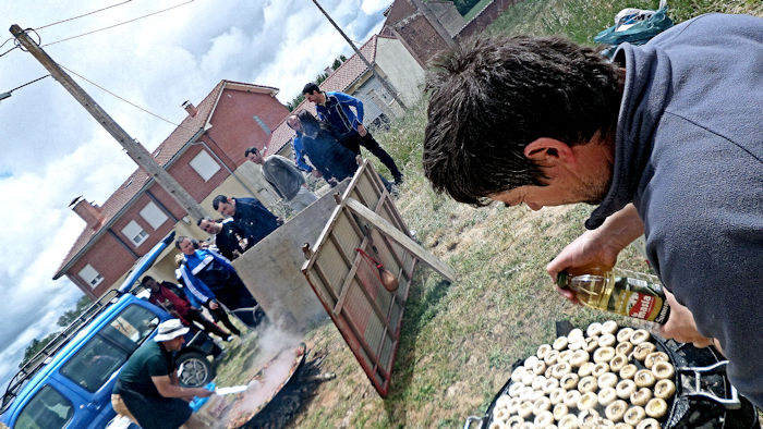 En la foto de arriba, se ve a Felipe haciendo la paella y a David Marcos haciendo champiñones a la parrilla con bacon.